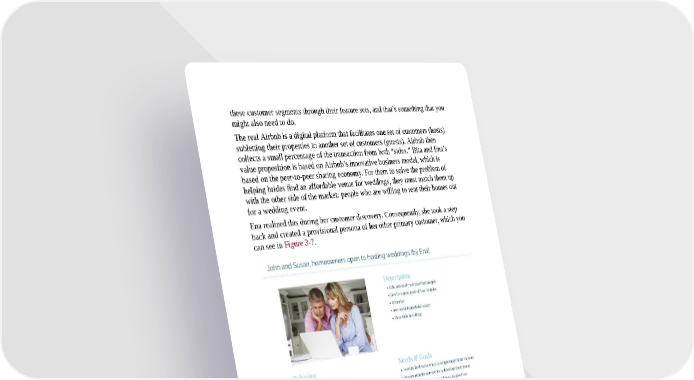these customer segments through their feature sets, and that’s something that you might also need to do. The real Airbnb is a digital platform that facilitates one set of customers (hosts) subletting their properties to another set of customers (guests). Airbnb then collects a small percentage of the transaction from both “sides.” Bita and Ena’s value proposition is based on Airbnb’s innovative business model, which is based on the peer-to-peer sharing economy. For them to solve the problem of helping brides find an affordable venue for weddings, they must match them up with the other side of the market: people who are willing to rent their homes out for a wedding event. Ena realized this during her customer discovery. Consequently, she took a step back and created a provisional persona of her other primary customer, which you can see in Figure 3-7. Figure 3-7. Ena’s provisional persona for a wedding venue host This is the customer segment that also must exist to make her value proposition work. Ena needs people like John and Susan: people who own nice homes in Malibu and are open to innovative solutions for taking advantage of their home’s value. They are probably older than our brides-to-be and quite concerned that their homes don’t get trashed, or so Ena’s persona assumes.