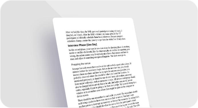 After we had this data, the SME gave each participant a rating of 1 (no), 2 (maybe), or 3 (yes). After the SME’s debrief, my team called all the “3” participants to officially schedule them for an interview. Because people’s schedules change, ensure that you try to get them in within 5 to 10 days later. Interview Phase (One Day) In this second phase, your team is now executing the planning phase. Everything needs to run like clockwork, like the choreography of a ballet. If something goes wrong, the action cannot stop. Everybody must know their places and how to react and adjust if something unexpected happens. The show must go on. Prepping the venue Arrange for each researcher to arrive at the café to find a good table at least 30 minutes before the interviews begin. Before the interview day, you should instruct them on where and how to set up in the quietest area possible; you probably observed where this should be when you found the location. As mentioned previously, it should be out-of-view from café workers and away from major walkways, such as entrances or exits. All devices and laptops should also be charged before arrival. But to be safe, find tables near an AC power outlet, especially if you’re going to be there for a while. Try to avoid sitting by a window or in an outdoor area where there might be glare on the computer or device screen. There should be one researcher for each table you need. The researchers should each bring a jacket to throw over an extra chair to save it. You don’t want another patron to interrupt an interview or distract the researcher by asking if it’s free. The researcher should do what she can to limit the participant’s visual distraction, too. For example, the researcher can sit facing out toward the main café while the participant sits facing the researcher and only the wall. The table should be clean — food and beverages should be limited. Your team should always have eaten beforehand, and participants should receive at least one beverage of their choice. Ideally, your team will play your solution prototype on a tablet device because it’s easier to pass to participants, and unlike a laptop screen, it won’t block the participant’s face from you. Ensure that all devices work properly before the interviews begin. Is your demonstration functioning properly on it? Can each device connect to WiFi? If a stakeholder or note-taker joins the researcher, they should sit directly across from each other; this way the participants will sit in between them, providing an optimal view of their reactions and interactions with
