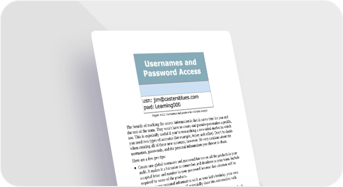 Figure 4-12. Usernames and passwords cell data sample The benefit of tracking the access information is that it saves time for you and the rest of the team. They won’t have to create and pseudo-personalize a profile, too. This is especially useful if you’re researching a two-sided market in which you need two types of accounts (for example, buyer and seller). Don’t be dumb when creating all of these new accounts, however. Be very cautious about the usernames, passwords, and the personal information you choose to share. Here are a few pro tips: Create one global username and password for use on all the products in your audit. It makes it a lot easier to remember and distribute to your team. Include a capital letter and number in your password because that criterion will be required by some of the products. Don’t ever use personal information such as your kid’s birthday, your own passwords, or profanity. You will potentially share this information with clients or colleagues. Do not log on (single sign-on) using your personal or professional Facebook (or any social network) account ever. If you are creating profiles on social networks, do not use your personal or work email address! Instead, create secondary accounts on Gmail or Yahoo first. Then, use these fake email accounts to create fake profiles. If it is a transactional website you are researching, purchase something. If it is an app that you must purchase (versus a free one), pay for it. Don’t be cheap! It’s usually only a few dollars here or there. Having one user account for your entire team to learn from is worth the financial investment.