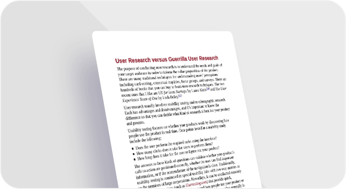User Research versus Guerrilla User Research The purpose of conducting user research is to understand the needs and goals of your target audience in order to inform the value proposition of the product. There are many traditional techniques for understanding users’ perceptions including card-sorting, contextual inquiries, focus groups, and surveys. There are hundreds of books that you can buy to learn user-research techniques. The two [56] recent ones that I like are UX for Lean Startups by Laura Klein and The User [57] Experience Team of One by Leah Buley. User research usually involves usability testing and/or ethnographic research. Each has advantages and disadvantages, and it’s important to know the difference so that you can decide what kind of research is best for your product and process. Usability testing focuses on whether your products work by discovering how people use the product in real time. Data points tested in a usability study include the following: Does the user perform the required tasks using the interface? How many clicks does it take for users to perform them? How long does it take for the user to figure out your product? The answers to these kinds of questions can validate whether your product’s calls to action are positioned correctly, whether the user can find important information, or if the nomenclature of the navigation is clear. Traditionally, usability testing is conducted in special usability labs with two-way mirrors or on the premises of large corporations. Nowadays, it can be conducted remotely by using online services (such as Usertesting.com) that provide quick, reasonably priced screencast videos that record how people use your product or prototype while speaking their thoughts. However, usability testing generally is to interaction design what quality control is to physical product design. This means that it’s typically conducted after the product is completed but before it’s released to the general public. In contrast, ethnographic research — the study of people in their natural environment — is all about getting to the deep, dark places much like the qualitative personas Alan Cooper advocated in Chapter 3. To get an idea of how in-depth it can be, let’s look at one of my heroes, anthropologist Dr. Genevieve Bell from Intel. In 2005, I saw her give an inspiring keynote speech about a project she conducted in Asia to learn how people use technology. The research