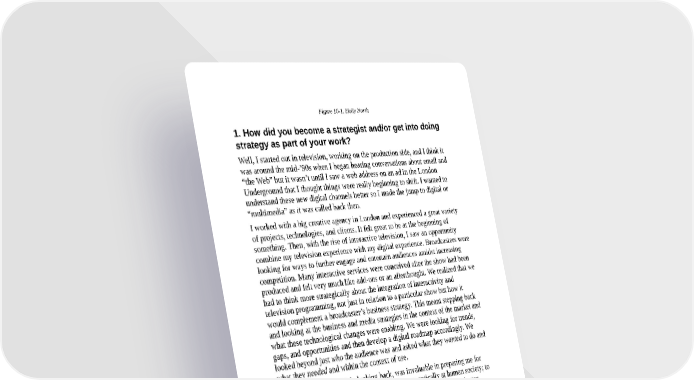 Figure 10-1. Holly North 1. How did you become a strategist and/or get into doing strategy as part of your work? Well, I started out in television, working on the production side, and I think it was around the mid-’90s when I began hearing conversations about email and “the Web” but it wasn’t until I saw a web address on an ad in the London Underground that I thought things were really beginning to shift. I wanted to understand these new digital channels better so I made the jump to digital or “multimedia” as it was called back then. I worked with a big creative agency in London and experienced a great variety of projects, technologies, and clients. It felt great to be at the beginning of something. Then, with the rise of interactive television, I saw an opportunity combine my television experience with my digital experience. Broadcasters were looking for ways to further engage and entertain audiences amidst increasing competition. Many interactive services were conceived after the show had been produced and felt very much like add-ons or an afterthought. We realized that we had to think more strategically about the integration of interactivity and television programming, not just in relation to a particular show but how it would complement a broadcaster’s business strategy. This meant stepping back and looking at the business and media strategies in the context of the market and what these technological changes were enabling. We were looking for trends, gaps, and opportunities and then develop a digital roadmap accordingly. We looked beyond just who the audience was and asked what they wanted to do and what they needed and within the context of use. I studied sociology, which, looking back, was invaluable in preparing me for what I do now. Sociology requires you look systematically at human society; to examine the relationships between the individual and society and to better understand people’s motives, occupations, traditions, and cultures. As it turns out, this is great training for a UX strategist. I didn’t set out to be a strategist — certainly not a UX strategist. I do think that in order to be successful one needs a level of strategic thinking, a strategic framework. For me, this means seeking out fact-based information, not relying on generalized theories, questioning assumptions. It involves compromise, understanding our competencies, challenging our thinking. More important, perhaps, it means determining what the right questions to ask are.