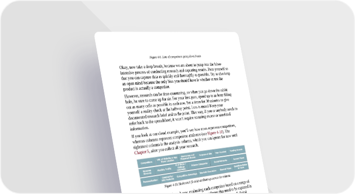 Figure 4-9. Lists of competitors going down Y-axis Okay, now take a deep breath, because we are about to jump into the labor- intensive process of conducting research and capturing results. Pace yourself so that you can capture data as quickly and thoroughly as possible. Try to also keep an open mind because the only bias you should have is whether or not the product is actually a competitor. However, research can be time-consuming, so when you go down the rabbit hole, be sure to come up for air. For your first pass, spend up to an hour filling out as many cells as possible in each row. Set a timer for 30 minutes to give yourself a reality check at the halfway point. Less is more! Keep your documented research brief and to the point. This way, if you or anybody needs to refer back to the spreadsheet, it won’t require scanning excess or unrelated information. If you look at our cloud example, you’ll see how rows represent competitors, whereas columns represent competitor attributes (see Figure 4-10). The rightmost column is the analysis column, which you can ignore for now until Chapter 5, after you collect all your research. Figure 4-10. Horizontal (X-axis) attributes go across the columns We’re going to attack each row, evaluating each competitor based on a range of market and UX attributes. I will explain the attributes that need to be captured in each column. Not all of the attributes are applicable or relevant to all digital products. Just skip or delete the ones that don’t apply to your product. There also might be attributes that need to be considered that are not in this spreadsheet; feel free to add anything relevant by adding a new column or replacing one that you don’t need to use. What is crucial is that the pros and cons of the UX are clearly evaluated. URL of website or app store location This is where you put the primary online location that customers use to access the product. For desktop-only products, it will be the website address (URL), as