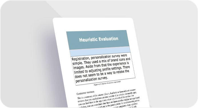 Figure 4-25. Heuristic Evaluation result sample Customer reviews This is a summary of the amount (that is, hundreds or thousands) of customer reviews that you can find on a product outside of its website. For mobile apps, you can find these in the app stores where you download the product. For websites, you can sometimes find these on Quora or other similar message-board platforms where users reach out to the general public for troubleshooting advice. You are looking for the latest recurring customer complaints about a product because those potential pain points are something your team might be able improve upon. General/miscellaneous notes This is miscellaneous information that doesn’t fit into the other columns. You can use this for any research relevant to your product that you want to track. Feel free to change the name of this column if needed. Questions/notes to team or self Remember this is a collaborative document. Other people will be reading your