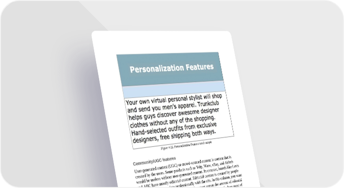 Figure 4-22. Personalization Features result sample Community/UGC features User-generated content (UGC) or crowd-sourced content is content that is created by the users. Some products such as Yelp, Waze, eBay, and Airbnb would be useless without user-generated content. In contrast, brands like Levis and ABC have mostly editorial content. Editorial content is created by people who work for or associate professionally with the site. In this column, you want to estimate the amount of user-generated content versus the amount of editorial content, as illustrated in Figure 4-23. You want to get a sense of where most of the content is coming from. Look for features like message boards, the ability to post content (reviews, stories, and so on), and user comments. Be specific about which features are crucial and try to cite concrete examples of how they bring value to the product’s other customers.