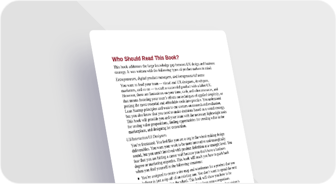 Who Should Read This Book? This book addresses the large knowledge gap between UX design and business strategy. It was written with the following types of product makers in mind: Entrepreneurs, digital product managers, and intrapreneurial teams You want to lead your team — visual and UX designers, developers, marketers, and so on — to craft a successful product with a killer UX. However, there are limitations on your time, cash, and other resources, and that means focusing your team’s efforts on techniques of applied simplicity, or putting the most essential and affordable tools into practice. You understand Lean Startup principles and want to cut corners on research and evaluation, but you also know that you need to make decisions based on a sound strategy. This book will provide you and your team with the necessary lightweight tools for testing value propositions, finding opportunities for creating value in the marketplace, and designing for conversion. UX/Interaction/UI Designers You’re frustrated. You feel like you are a cog in the wheel making design deliverables. You want your work to be more innovative and strategically sound, but you aren’t involved with product definition at a strategic level. You fear that you are hitting a career wall because you don’t have a business degree or marketing expertise. This book will teach you how to push back when you find yourself in the following situations: You’re assigned to create a site map and wireframes for a product that you believe is just a rip-off of an existing one. You don’t want to spend the next six months reinventing the wheel. This book will show you how to be innovative by systematically cherry-picking from your competitors. You have a stakeholder who is 100 percent certain that his product vision is right, and you are told to implement it as is. You want to do user research to help him deviate from his original vision, but he won’t give you the budget. This book will demonstrate different options for being intrapreneurial with or without buy-in. You get handed a massive requirements document for a transactional product and are told to come up with a design that will increase conversion. This book will show you how to break down the stages of engagement and map desired actions to metrics.