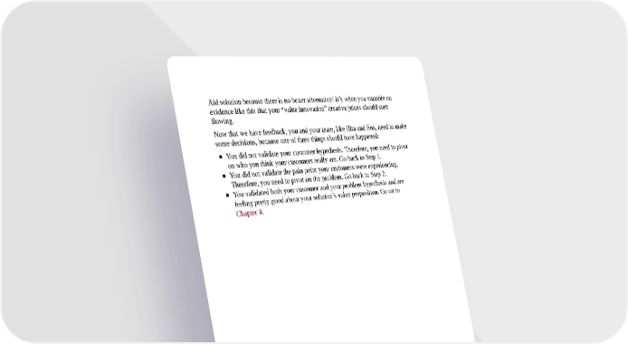 Aid solution because there is no better alternative! It’s when you stumble on evidence like this that your “value innovation” creative juices should start flowing. Now that we have feedback, you and your team, like Bita and Ena, need to make some decisions, because one of three things should have happened: You did not validate your customer hypothesis. Therefore, you need to pivot on who you think your customers really are. Go back to Step 1. You did not validate the pain point your customers were experiencing. Therefore, you need to pivot on the problem. Go back to Step 2. You validated both your customer and your problem hypothesis and are feeling pretty good about your solution’s value proposition. Go on to Chapter 4.