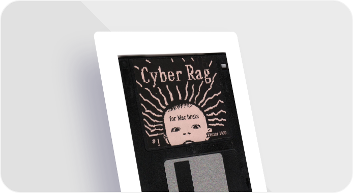 Figure 6-2. Cyber Rag (1990) electronic magazine on floppy disk Sure, there were some competitors in the marketplace. For instance, there were nonanimated HyperCard stacks with tech-centric content. There was also an interactive art disk that ran on the less popular Commodore Amiga and could be downloaded from a bulletin-board service (BBS). But there was no other digital product like Cyber Rag, and I saw the golden opportunity to make digital content more mainstream and accessible to the masses by placing it on a Mac-based floppy disk.
