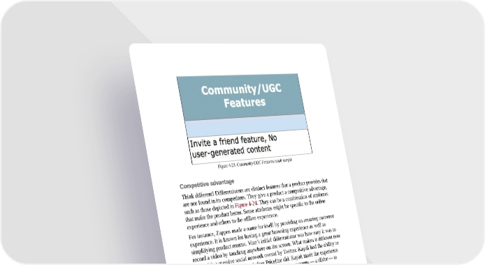 Figure 4-23. Community/UGC Features result sample Competitive advantage Think different! Differentiators are distinct features that a product provides that are not found in its competitors. They give a product a competitive advantage, such as those depicted in Figure 4-24. They can be a combination of attributes that make the product better. Some attributes might be specific to the online experience and others to the offline experience. For instance, Zappos made a name for itself by providing an amazing customer experience. It is known for having a great browsing experience as well as simplifying product returns. Vine’s initial differentiator was how easy it was to record a video by touching anywhere on the screen. What makes it different now is that it’s a massive social network owned by Twitter. Kayak had the ability to filter live search results long before Priceline did. Kayak made the experience even better by providing the simplest of interactive patterns — a slider — to make this live filtering fun. Figure out the top three differentiators of each product and list them in this cell. Ask yourself questions such as which features were successful because the product was first-to-market? Can those features be easily replicated? Which is better, the filtering or the large database of options? Which attributes are specific to the online experience?