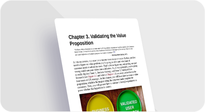 Chapter 3. Validating the Value Proposition “To know what a business is we must start with its purpose. Its purpose must lie outside of the business itself. In fact, it must lie in society since business enterprise is the organ of the society. There is only [24] one valid definition of business purpose: to create a customer.” — PETER DRUCKER, 1973 AT THE BEGINNING, YOU DON’T JUST DEFINE YOUR PRODUCT VISION. Rather, you first need to figure out what problem you’re going to solve and what kind of customer needs it solved the most. That’s a lot to figure out, and getting one part wrong could turn your vision into a delusion. So, to stay grounded, you’re going to really dig into Tenet 1, Business Strategy, and Tenet 3, Validated User Research (see Figure 3-1 and refer to Chapter 2 if you need a refresher on the four tenets of UX strategy). In this chapter, you will learn how to create a value proposition, which is the magical thing that you must make tangible for customers. Then, you will go over how to validate it through experiments to prove whether that hypothesis is correct. Figure 3-1. Tenet 1 and Tenet 3: Business Strategy and Validated User Research