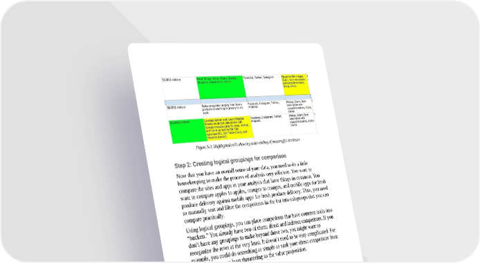 Figure 5-3. Highlighted cells showing color-coding of meaningful attributes Step 2: Creating logical groupings for comparison Now that you have an overall sense of your data, you need to do a little housekeeping to make the process of analysis very efficient. You want to compare the sites and apps in your analysis that have things in common. You want to compare apples to apples, oranges to oranges, and mobile apps for fresh produce delivery against mobile apps for fresh produce delivery. Thus, you need to manually sort and filter the competitors in the list into subgroups that you can compare practically. Using logical groupings, you can place competitors that have common traits into “buckets.” You already have two of them: direct and indirect competitors. If you don’t have any groupings to make beyond those two, you might want to reorganize the rows at the very least. It doesn’t need to be very complicated. For example, you could do something as simple as rank your direct competitors from most threatening to least threatening to the value proposition. Here are examples of potential subgroups: Logical Subgroup Examples Desktop versus mobile platform Content type (for example, ecommerce, publishers, or aggregators) Horizontal markets (Craig’s List to Amazon to eBay or Target to Walmart) Vertical markets (clothing, health, banking, and so on) Business models