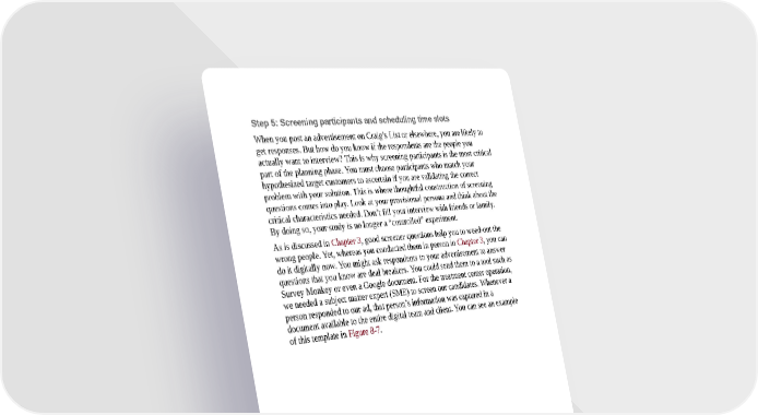 Step 5: Screening participants and scheduling time slots When you post an advertisement on Craig’s List or elsewhere, you are likely to get responses. But how do you know if the respondents are the people you actually want to interview? This is why screening participants is the most critical part of the planning phase. You must choose participants who match your hypothesized target customers to ascertain if you are validating the correct problem with your solution. This is where thoughtful construction of screening questions comes into play. Look at your provisional persona and think about the critical characteristics needed. Don’t fill your interview with friends or family. By doing so, your study is no longer a “controlled” experiment. As is discussed in Chapter 3, good screener questions help you to weed-out the wrong people. Yet, whereas you conducted them in person in Chapter 3, you can do it digitally now. You might ask respondents to your advertisement to answer questions that you know are deal breakers. You could send them to a tool such as Survey Monkey or even a Google document. For the treatment center operation, we needed a subject matter expert (SME) to screen our candidates. Whenever a person responded to our ad, that person’s information was captured in a document available to the entire digital team and client. You can see an example of this template in Figure 8-7.