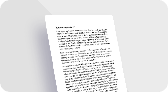 innovative product? In an agency environment it starts with a brief. The client usually has the basic idea of the product or service it would like to create or at least the problem that it wants to solve. Often it might have an idea for the solution without completely understanding the true source of the problem, and it needs help with really clarifying both the problem space and the opportunity. So in the agency context, we begin by downloading the knowledge from the client, synthesizing what it knows and what the market tells us, and then coming up with a clear destination and a roadmap to get us there. In the case of a tech startup, things are a little bit more fluid and iterative. The approach is more or less the same, but less time and effort is spent on consensus building across the client’s organization. More time is spent on refining and optimizing. There are less artificial time constraints, but often more resource constraints, so we must be very lean in our thinking. In my current startup, the vision is clear and set, but the strategy has evolved and continues to evolve. Our initial vision came from us observing a certain kind of behavior that people were exhibiting around the way they were using email where email wasn’t the most efficient solution. We thought something could be done about that. We didn’t immediately know the perfect solution, but we had a very clearly articulated problem. We were not sure if the solution was a different kind of email app, or note-taking app, or even a task-management tool. So, step number one is to clearly identify (or make an educated hypothesis) about the opportunity space, or the problem that you are addressing for the end user. Based on this knowledge, we then form a strategy, a plan of action for the solution. In our case, we began to come up with a few different solutions that we believed were possible alternatives. But we didn’t know for sure until we really began designing, and prototyping. When we understand more or less what we wanted to design, we could do a more focused competitive analysis, looking at other similar products and talking to people who used those products. And based on that knowledge we tweaked our prototypes until we basically ended up with one solid solution. The lesson is that strategy is iterative just like everything else. You come up with a hypothesis, you create a plan, and you move forward until you learn new information, reposition the hypothesis, and adjust the plan. Strategy is a living experience. 10. What are important skills or mindsets for a strategist to have? Or what makes you good at your job?