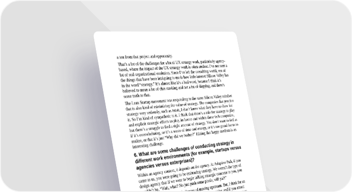 a ton from that project and opportunity. That’s a lot of the challenges for a lot of UX strategy work, particularly agency- based, where the impact of the UX strategy work is often unclear. I’ve not seen a lot of real organizational evolution. Since I’ve left the consulting world, one of the things that have been intriguing to me is how little interest Silicon Valley has in the word “strategy.” It’s almost like it’s a bad word, because I think it’s believed to mean a lot of chin stroking and not a lot of shipping, and there’s some truth to that. The Lean Startup movement was responding to the same Silicon Valley mindset that is also kind of minimizing the value of strategy. The companies that practice strategy very seriously, such as Intuit, I don’t know what they have to show for it. So I’m kind of sympathetic to it. I think that there’s a role for strategy to play and explicit strategic efforts to play, in-house and within these tech companies, but there’s a struggle to find a right amount of strategy. You don’t want to feel as if it’s overwhelming, or it’s a waste of time and energy, or it’s too grand for us to realize, or that it’s just “Why did we bother?” Hitting that happy medium is an interesting challenge. 6. What are some challenges of conducting strategy in different work environments (for example, startups versus agencies versus enterprises)? Within an agency context, it depends on the agency. At Adaptive Path, if you came to us, you were going to be embracing strategy. We weren’t the type of design agency that if we were to begin talking strategic concerns to you, you wouldn’t be, “Wait, what? No just push some pixels, will ya?!” Some agencies have those challenges of moving upstream. But, I think for an agency, you have to set yourself up as a strategic provider, and if you attract clients, you’re doing strategy work. That’s relatively easy. Within that agency environment, and because of the way the projects tend to be structured, you can kind of create the safe space for strategy to be done. Now, the challenge for an agency, which I was referring to before, is that strategy can often feel irrelevant, by the time you go deliver it, or months later when you follow up on it, you’re like, “So what are you doing?” “Oh well, we had a reorg or this person left, or that person left, or what it is. We shifted this, that, and the other thing.” So the work you did just kind of doesn’t get used. So that’s the challenge for an agency. The challenges for doing it in-house, at an enterprise, are for strategy to remain relevant. One method is to connect the strategic work to the production work,