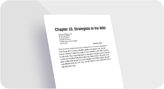 Chapter 10. Strategists in the Wild Gotta stop drifting around Kill this ugly duckling We’ve got the power And must not misuse it Cuz life is short and full of thought I use the power. — THE FALL (1979) UNTIL RECENTLY, THERE HAVE BEEN FEW OPPORTUNITIES FOR PEOPLE who practice some flavor of UX strategy to huddle together and compare notes. For this reason, I decided to hunt down some of these strategists in the wild to interview for this book. They range from business strategists to design executives and have worked on everything from shoestring to big-budget projects. My goal was for them to share their perspectives and techniques even if their strategic practices were different from my own. They were all asked the same 10 questions. Here is what they had to say.