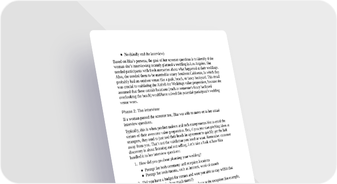 No (kindly end the interview) Based on Bita’s persona, the goal of her screener questions is to identify if the woman she’s interviewing recently planned a wedding in Los Angeles. She needed participants with fresh memories about what happened at their weddings. Also, she needed them to be married in sunny Southern California, in which they probably had an outdoor venue like a park, beach, or fancy backyard. This detail was crucial to validating the Airbnb for Weddings value proposition, because she assumed that these outside locations (such as someone’s fancy backyard overlooking the beach) would have solved this potential participant’s wedding venue woes. Phase 2: The interview If a woman passed the screener test, Bita was able to move on to her actual interview questions. Typically, this is when product makers and tech entrepreneurs like to extol the virtues of their awesome value proposition. But, if you just start pitching ideas at strangers, they tend to just nod their heads in agreement to quickly get the hell away from you. That’s not the validation you need or want. Remember customer discovery is about listening and not selling. Let’s take a look at how Bita handled it in her interview questions: 1. How did you go about planning your wedding? Prompt for both ceremony and reception locations Prompt for tools/means, such as Internet, word-of-mouth 2. Did you have a budget for venues and were you able to stay within that budget? (If not, by how much more?) 3. How many people were you planning to have at the reception (for example, 50 to 200)? 4. What were some of the challenges you faced in finding the venues (Prompt: e.g., finding the ideal location, such as by the beach)? 5. How did you overcome these challenges? Did you end up having to compromise on your ideal wedding? These questions actually set up the context for our solution. Now that the participant has that context, it’s time for Bita to ask her money-shot question. Bita: Excellent, thank you so much for all this great feedback. I have two last questions for you. 6. Have you ever heard of or tried a website called “Airbnb”?