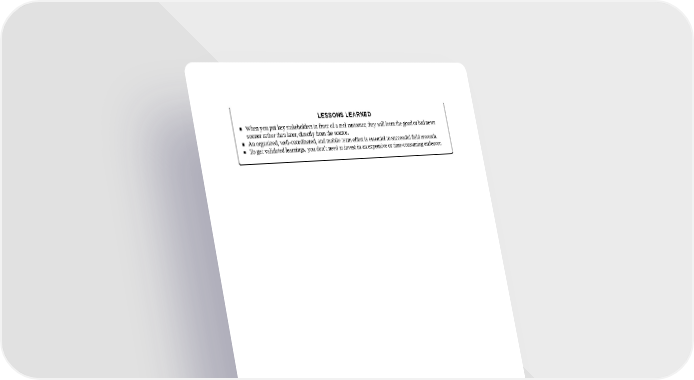 LESSONS LEARNED When you put key stakeholders in front of a real customer, they will learn the good or bad news sooner rather than later, directly from the source. An organized, well-coordinated, and mobile team effort is essential to successful field research. To get validated learnings, you don’t need to invest in an expensive or time-consuming endeavor.