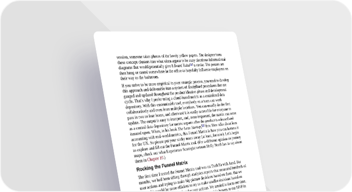 session, someone takes photos of the lovely yellow papers. The designer turns these concept clusters into what often appear to be zany circuitous informational [65] diagrams that would potentially give Edward Tufte a stroke. The posters are then hung or stored somewhere in the office to hopefully influence employees on their way to the bathroom. If you strive to be more empirical in your strategic process, you need to develop this approach and deliverable into a system of disciplined procedures that are gauged and updated throughout the product ideation phase and development cycle. That’s why I prefer using a cloud-based matrix as a centralized data depository. With this customizable tool, everybody on a team can work collaboratively and even from multiple locations. You can usually do the first pass in two to four hours, and afterward it is easily accessible for everyone to update. The output is easy to interpret, and, more important, the matrix can serve as a central data depository for metric reports after the product is released and [66] iterated upon. When, in his book The Lean Startup, Eric Ries talks about lean accounting with real-world metrics, this Funnel Matrix is how you can harness it for the UX. So please put your sticky notes away (at least, for now). Let’s begin to explore and fill out the Funnel Matrix tool. (For a different opinion on journey maps, check out what Experience Strategist veteran Holly North has to say about them in Chapter 10.) Rocking the Funnel Matrix The first time I tested the Funnel Matrix tool was on TradeYa with Jared. For months, we had been sifting through analytics reports that measured hundreds of user actions and trying to make big-picture decisions based on them. But we figured it would be more efficient to try to make smaller decisions based on validated data output from singular user actions. We needed to focus our time, energy, and money on being able to make meaningful changes to our MVP in order to answer questions coming in from our investors. Thus, Jared, the developers (who Skyped in from India), and I spent an intense four-hour period filling out the exercise. In the UX Funnel Matrix tool, you have rows and columns made up of cells that need to be populated with your team’s carefully considered input. This input is driven by your user’s story, a narrative told over a specific period of time. If Jane discovers your online product (for the purposes of this example, TradeYa) while cruising her Facebook feed, what stages must she go through to become an active user? She’s probably not going to go from “suspect” to “repeat user” in one giant leap. Instead, she needs to be effortlessly funneled to this deeper level