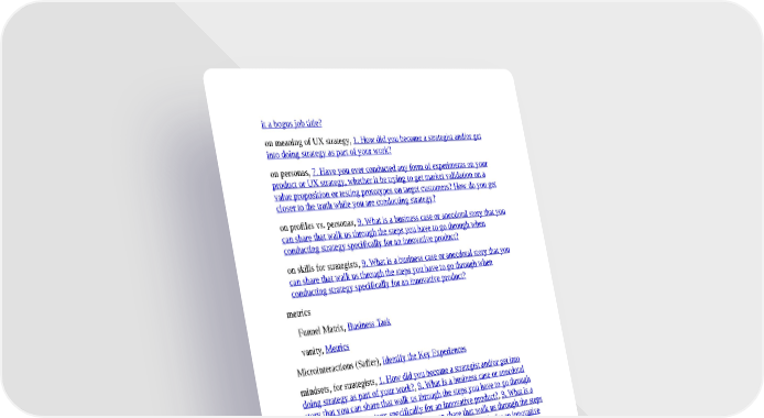 it a bogus job title? on meaning of UX strategy, 1. How did you become a strategist and/or get into doing strategy as part of your work? on personas, 7. Have you ever conducted any form of experiments on your product or UX strategy, whether it be trying to get market validation on a value proposition or testing prototypes on target customers? How do you get closer to the truth while you are conducting strategy? on profiles vs. personas, 9. What is a business case or anecdotal story that you can share that walk us through the steps you have to go through when conducting strategy specifically for an innovative product? on skills for strategists, 9. What is a business case or anecdotal story that you can share that walk us through the steps you have to go through when conducting strategy specifically for an innovative product? metrics Funnel Matrix, Business Task vanity, Metrics Microinteractions (Saffer), Identify the Key Experiences mindsets, for strategists, 1. How did you become a strategist and/or get into doing strategy as part of your work?, 9. What is a business case or anecdotal story that you can share that walk us through the steps you have to go through when conducting strategy specifically for an innovative product?, 9. What is a business case or anecdotal story that you can share that walk us through the steps you have to go through when conducting strategy specifically for an innovative product?, 9. What is a business case or anecdotal story that you can share that walks us through the steps you have to go through when conducting strategy specifically for an innovative product? Minimum Viable Product (MVP) about term, Identify the Key Experiences apprentice program, Seeding Growth Hackers experimenting with, Findings Brief, Section 5: Taking a stand/Your