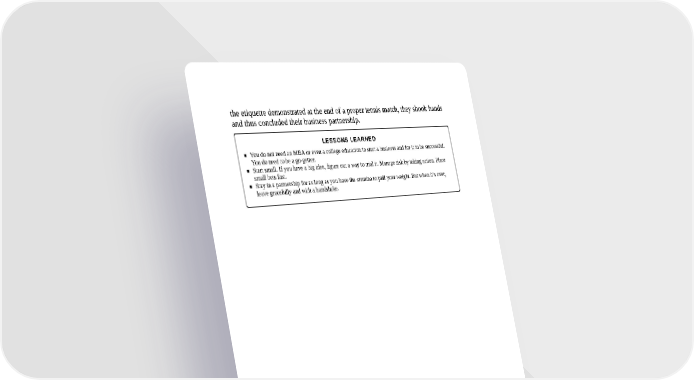 the etiquette demonstrated at the end of a proper tennis match, they shook hands and thus concluded their business partnership. LESSONS LEARNED You do not need an MBA or even a college education to start a business and for it to be successful. You do need to be a go-getter. Start small. If you have a big idea, figure out a way to trial it. Manage risk by taking action. Place small bets fast. Stay in a partnership for as long as you have the stamina to pull your weight. But when it’s over, leave gracefully and with a handshake.