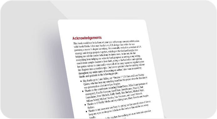 Acknowledgements This book would not be in front of your eyes without my constant collaboration with Sarah Dzida. I first met Sarah in my UX design class while she was pursuing a master’s degree in writing. We eventually worked on a number of UX strategy and design projects together, which gave her firsthand insights into helping me tell the stories behind my business cases. In the end, she did everything from helping me write the book proposal to serving as my writing coach from sample chapter to final draft, acting as the lead editor and applying her genius talents to structurally weave all of the crazy narratives together across the chapters into a seamless epic. I’m forever grateful to her for sticking with me throughout my entire quest of becoming an author. I also want to extend my thanks and gratitude to the following people: Big thanks go to Lane Halley, my “Number 1” UX Guru and Lean Startup Queen, who has been my sounding board for this project since the first time it was presented as a lecture in Los Angeles. Thanks to the contributors including Chaim Diesto, Miles Frank (portraits of strategists), Ena De Guzman, Geoff Katz, Jared Krause, Zhan Li, Paul Lumsdaine, Peter Merholz, Holly North, Bita Sheibani, Michael Sigal, Milana Sobol, Michael Sueoka, Eric Swenson, and Laurel Wetzork. Thanks to O’Reilly Media and my editing team, Mary Treseler and Angela Rufino. Thanks to my awesome son Terry for giving me that special raison d’ être to keep my eyes on the prize. I dedicate this book to him and the rest of my family. Thanks to all my ballet teachers for teaching me an art form and a practice that kept me sane throughout this project. Thank you, Los Angeles, for being my home.
