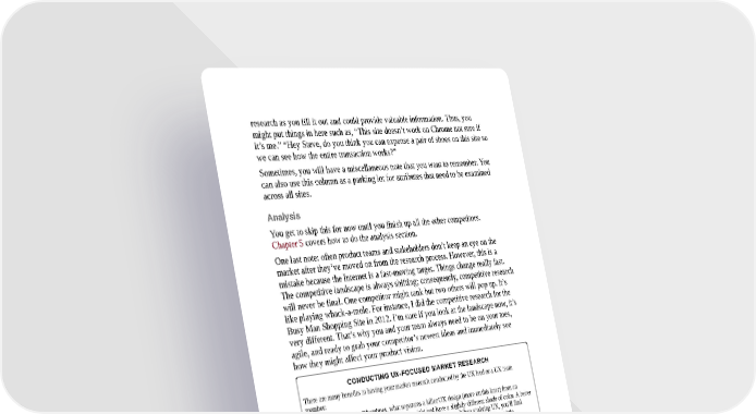 research as you fill it out and could provide valuable information. Thus, you might put things in here such as, “This site doesn’t work on Chrome not sure if it’s me.” “Hey Steve, do you think you can expense a pair of shoes on this site so we can see how the entire transaction works?” Sometimes, you will have a miscellaneous note that you want to remember. You can also use this column as a parking lot for attributes that need to be examined across all sites. Analysis You get to skip this for now until you finish up all the other competitors. Chapter 5 covers how to do the analysis section. One last note: often product teams and stakeholders don’t keep an eye on the market after they’ve moved on from the research process. However, this is a mistake because the Internet is a fast-moving target. Things change really fast. The competitive landscape is always shifting; consequently, competitive research will never be final. One competitor might tank but two others will pop up. It’s like playing whack-a-mole. For instance, I did the competitive research for the Busy Man Shopping Site in 2012. I’m sure if you look at the landscape now, it’s very different. That’s why you and your team always need to be on your toes, agile, and ready to grab your competitor’s newest ideas and immediately see how they might affect your product vision. CONDUCTING UX-FOCUSED MARKET RESEARCH There are many benefits to having your market research conducted by the UX lead or a UX team member: Design enhancement. Oftentimes, what separates a killer UX design (more on this later) from an average one is nuance. A better visual design might just have a slightly different shade of color. A better music composition might contain a tone played at the perfect beat. When studying UX, you’ll find nuance in the articulation of an unexpected capability (or power for the user) through a subtle enhancement in either the interface or flow of screens. It might be a prompt that appears only once but at the precise time of need. Content messaging (“Saving...saved”) is one of my favorite forms of nuance. Simplicity. UX designers think about the number of clicks and how easy it is for someone to accomplish a task. They often spot an opportunity for improvement by changing an interaction design pattern. Think back to our Tinder example, and how a simple swipe left versus right became a major binary decision. Cost. It’s faster to have the same UX designer research and build the product. He’ll see which interaction-design best practices (like “Advanced Search”) actually work the best by examining the competition. He’ll become expert in the subject matter by researching each site’s taxonomy and content. Tag team. It’s an opportunity to let a UX lead or strategist mentor a junior-level researcher. The lead will be more efficient when the junior team member does the research and the lead provides analysis. The entire UX team will become familiar with the design of all of the competitors.