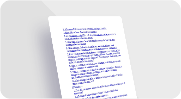 2. What does UX strategy mean to you? Is it a bogus job title? 3. How did you learn about business strategy? 4. Do you think it’s helpful for UX designers who are aspiring strategists to get an MBA or have a business degree? 5. What types of products have you done the strategy for that were most exciting or fun to work on? 6. What are some challenges of conducting strategy in different work environments (for example, startups versus agencies versus enterprises)? 7. Have you ever conducted any form of experiments on your product or UX strategy, whether it be trying to get market validation on a value proposition or testing prototypes on target customers? How do you get closer to the truth while you are conducting strategy? 8. What is your secret weapon or go-to technique for devising strategies or building consensus on a shared vision? 9. What is a business case or anecdotal story that you can share that walk us through the steps you have to go through when conducting strategy specifically for an innovative product? 10. What are important skills or mindsets for a strategist to have? Or what makes you good at your job? Milana Sobol 1. How did you become a strategist and/or get into doing strategy as part of your work? 2. What does UX strategy mean to you? Is it a bogus job title? 3. How did you learn about business strategy? 4. Do you think it’s helpful for UX designers who are aspiring strategists to get an MBA or have a business degree? 5. What types of products have you done the strategy for that were the most exciting or fun to work on? 6. What are the some challenges of conducting strategy in different work environments (for example, startups versus agencies versus enterprises)? 7. Have you ever conducted any form of experiments on your product or UX strategy, whether it be trying to get market validation on a value proposition or testing prototypes on target customers? How do you get closer to the truth while you are conducting strategy? 8. What is your secret weapon or go-to technique for devising strategies or