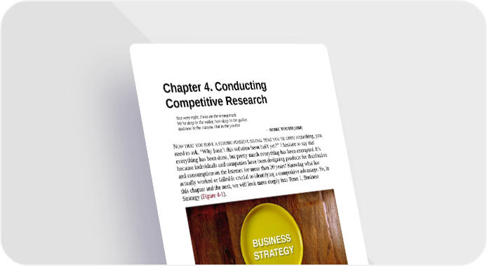 Chapter 4. Conducting Competitive Research You were right. I was on the wrong track. We’re deep in the valley, how deep in the gulley. And now in the canyon. Out in the yonder. — SONIC YOUTH (1984) NOW THAT YOU HAVE A STRONG POSITIVE SIGNAL THAT YOU’RE ONTO something, you need to ask, “Why hasn’t this solution been built yet?” I hesitate to say that everything has been done, but pretty much everything has been attempted. It’s because individuals and companies have been designing products for distribution and consumption on the Internet for more than 20 years! Knowing what has actually worked or failed is crucial to identifying a competitive advantage. So, in this chapter and the next, we will look more deeply into Tenet 1, Business Strategy (Figure 4-1). Figure 4-1. Tenet 1: Business Strategy
