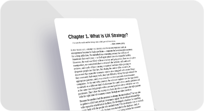Chapter 1. What Is UX Strategy? I’ve seen the needle and the damage done, a little part of it in everyone. — NEIL YOUNG (1972) A FEW YEARS AGO, A HIGHLY SUCCESSFUL SOFTWARE ENGINEER BECAME an entrepreneur because he had a problem — someone he loved needed treatment for a drug addiction. He embarked on a daunting journey that millions of Americans face each year — to find appropriate care at a reputable facility. However, the road was filled with uncertainty and pain points; there was no price transparency, no centralized place to research the facilities with unbiased reviews, and scads of liars running overpriced facilities while preying on desperate people just like him. But during the course of his research, he discovered that reputable treatment centers also struggled with certain things: they constantly had empty beds; they had difficulty sifting through referrals for appropriate patients; and it was a hassle to collect payments from insurance companies. At the end of his journey, the software engineer saw the opportunity to embark on a different kind of adventure. He could solve a market problem and at the same time help people with a personal problem about which he was very passionate. That’s how his startup was born; his idea to connect the right patients with the right kind of treatment centers through an online interface. [1] Because his product had the potential to disrupt the marketplace, he was able to gather a solid team and get investment capital. He developed relationships with reputable rehabilitation facilities. He developed a database for matching [2] empty beds with the people who needed them. He developed a way to vet each facility to ensure that only the best were included in the database. And, of course, he and his team developed a consumer-facing website for customer acquisition. They didn’t leave anything to chance. They also conducted a couple of online surveys with people who had looked for treatment in the past. They hired public relations, marketing, and search-engine optimization (SEO) firms. They bought advertising in print and online publications; talked to industry experts; and found many business-side partners interested in their value proposition and who wanted to be a part of it. When the site went live, they ran numerous online advertising campaigns using Facebook and Google to promote the financial savings and data-rich reviews that customers could get by using their service. From these campaigns, only a small