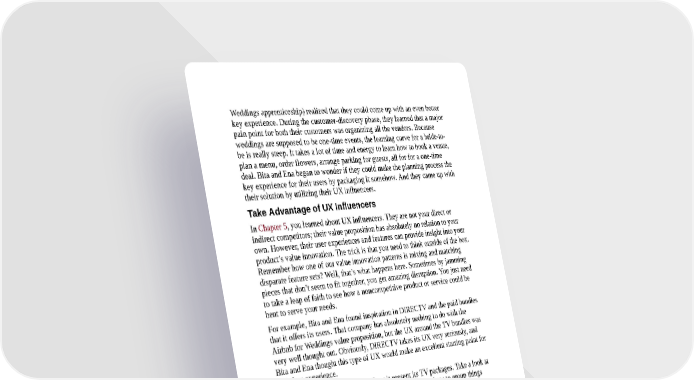 Weddings apprenticeship) realized that they could come up with an even better key experience. During the customer-discovery phase, they learned that a major pain point for both their customers was organizing all the vendors. Because weddings are supposed to be one-time events, the learning curve for a bride-to- be is really steep. It takes a lot of time and energy to learn how to book a venue, plan a menu, order flowers, arrange parking for guests, all for for a one-time deal. Bita and Ena began to wonder if they could make the planning process the key experience for their users by packaging it somehow. And they came up with their solution by utilizing their UX influencers. Take Advantage of UX Influencers In Chapter 5, you learned about UX influencers. They are not your direct or indirect competitors; their value proposition has absolutely no relation to your own. However, their user experiences and features can provide insight into your product’s value innovation. The trick is that you need to think outside of the box. Remember how one of our value innovation patterns is mixing and matching disparate feature sets? Well, that’s what happens here. Sometimes by jamming pieces that don’t seem to fit together, you get amazing disruption. You just need to take a leap of faith to see how a noncompetitive product or service could be bent to serve your needs. For example, Bita and Ena found inspiration in DIRECTV and the paid bundles that it offers its users. That company has absolutely nothing to do with the Airbnb for Weddings value proposition, but the UX around the TV bundles was very well thought out. Obviously, DIRECTV takes its UX very seriously, and Bita and Ena thought this type of UX would make an excellent starting point for their key experience. First, let’s visit DIRECTV to see how it present its TV packages. Take a look at Figure 6-7; there are quite a few interesting ideas about how to group things together and allow people to customize their own TV package. You might even see a glimmer of a potential new business model. Look closely. (Hint: it’s the concept of a turnkey solutions.)
