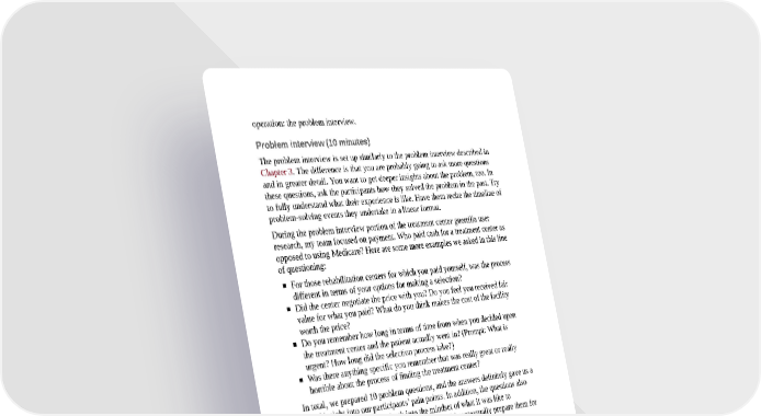 operation: the problem interview. Problem interview (10 minutes) The problem interview is set up similarly to the problem interview described in Chapter 3. The difference is that you are probably going to ask more questions and in greater detail. You want to get deeper insights about the problem, too. In these questions, ask the participants how they solved the problem in the past. Try to fully understand what their experience is like. Have them recite the timeline of problem-solving events they undertake in a linear format. During the problem interview portion of the treatment center guerrilla user research, my team focused on payment. Who paid cash for a treatment center as opposed to using Medicare? Here are some more examples we asked in this line of questioning: For those rehabilitation centers for which you paid yourself, was the process different in terms of your options for making a selection? Did the center negotiate the price with you? Do you feel you received fair value for what you paid? What do you think makes the cost of the facility worth the price? Do you remember how long in terms of time from when you decided upon the treatment center and the patient actually went in? (Prompt: What is urgent? How long did the selection process take?) Was there anything specific you remember that was really great or really horrible about the process of finding the treatment center? In total, we prepared 10 problem questions, and the answers definitely gave us a lot of insight into our participants’ pain points. In addition, the questions also helped get the participants back into the mindset of what it was like to experience those problems. In this way, we could contextually prepare them for the solution interview. Solution demonstration plus interview (15 minutes) The problem interview sets the stage for the solution interview, in which you reveal your product solution and learn if it solves the customer’s problem. You might need to create several solution concepts and a set of questions for each key experience you need to present. In the case of the treatment center operation, my team presented three solution demonstrations for three key experiences, as shown in Figure 8-4. If you find yourself in that scenario, schedule your time accordingly.