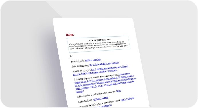 Index A NOTE ON THE DIGITAL INDEX A link in an index entry is displayed as the section title in which that entry appears. Because some sections have multiple index markers, it is not unusual for an entry to have several links to the same section. Clicking on any link will take you directly to the place in the text in which the marker appears. A a/b testing tools, Validated Learnings abductive reasoning, The analysis column of each competitor About Face (Cooper), Step 2: Identify your customer segment’s (biggest) problem, User Research versus Guerrilla User Research Adaptive Path project, working on ecommerce platform, 7. Have you ever conducted any form of experiments on your product or UX strategy, whether it be trying to get market validation on a value proposition or testing prototypes on target customers? How do you get closer to the truth while you are conducting strategy? Adobe Acrobat, as tool for interactive prototypes, Step 3 Adobe Analytics, Validated Learnings advertising for participants, in guerrilla user research, Step 3: Finding the venue(s) and mapping out team logistics Airbnb cool UX from influencers at, Findings Brief, Section 3: Indirect Competitors defining primary customer segment, If you don’t want to live on Fantasy Island... key experience for, Identify the Key Experiences killer user experience design of, Tenet 4: Killer UX Design solution prototype for, Step 1, Solution Prototype Reality Check: Why User Experiences and Business Models Must Go Hand in Hand