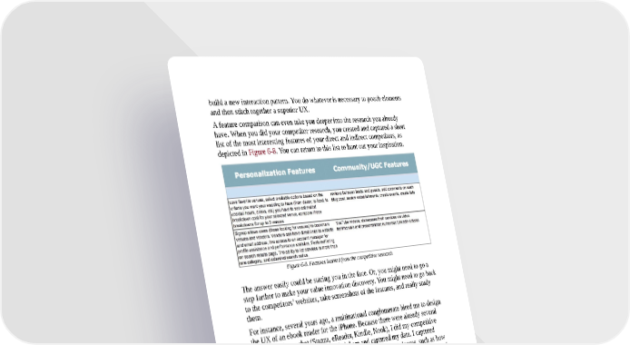 build a new interaction pattern. You do whatever is necessary to poach elements and then stitch together a superior UX. A feature comparison can even take you deeper into the research you already have. When you did your competitor research, you created and captured a short list of the most interesting features of your direct and indirect competitors, as depicted in Figure 6-8. You can return to this list to hunt out your inspiration. Figure 6-8. Features learned from the competitive research The answer easily could be staring you in the face. Or, you might need to go a step farther to make your value innovation discovery. You might need to go back to the competitors’ websites, take screenshots of the features, and really study them. For instance, several years ago, a multinational conglomerate hired me to design the UX of an ebook reader for the iPhone. Because there were already several readers on the market (Stanza, eReader, Kindle, Nook), I did my competitive research and analysis. I downloaded them and captured my data. I captured screenshots of many different functions, features, and experiences, such as how to browse for a book, the UI of the loading screen, the navigation of the table of contents, and how to highlight and annotate. Basically, I documented any feature that touched the key experiences I had to design. I then imported all of my screenshots into iPhoto and organized them based on their relationships to one another. As my final step, I arranged them onto large canvasses in Adobe InDesign so that I could compare them visually side-by-side. Based on these comparisons, I took notes when ideas occurred to me. Figure 6-9 presents a sample of that document.
