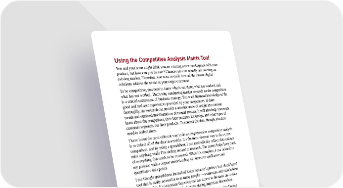 Using the Competitive Analysis Matrix Tool You and your team might think you are creating a new marketplace with your product, but how can you be sure? Chances are you actually are entering an existing market. Therefore, you want to study how all the current digital solutions address the needs of your target customers. To be competitive, you need to know what’s out there, what has worked, and what has not worked. That’s why conducting market research on the competition is a crucial component of business strategy. You want firsthand knowledge of the good and bad user experiences provided by your competitors. If done thoroughly, the research can provide a treasure trove of insight into current trends and outdated manifestations of mental models. It will also help your team learn about the competitors, their best practices for design, and what types of customer segments use their products. To connect the dots, though, you first need to collect them. I have found the most efficient way to do a comprehensive competitive analysis is to collect all of the data in a matrix. It’s the most obvious way to do a cross- comparison, and by using a spreadsheet, I can methodically collect data and not miss anything while I’m surfing around to research. The matrix helps keep track of everything that needs to be compared. When it’s complete, I can rationalize my position with a cogent understanding of numerous qualitative and quantitative data points. I use Google spreadsheets instead of Excel because I prefer a free cloud-based tool that is easily accessible to as many people — teammates and stakeholders — as possible. It’s important that everyone has access to the most up-to-date research, and this way I avoid blank stares during important discussions. Figure 4-3 depicts an example of a spreadsheet that I created using Google documents specifically for conducting competitive research. I am going to use the research that I conducted on the Busy Man’s Shopping Site for explanation and sample data. (As I first mentioned in the Preface, I’ve included a toolkit with this book. It’s for you to use with your teams. Refer to it for details on accessing the Competitive Analysis Matrix.)