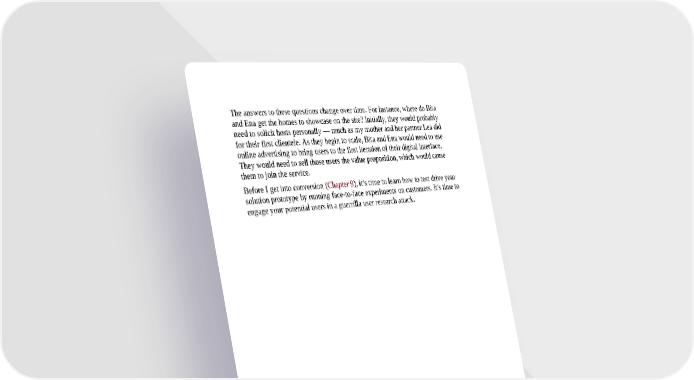 The answers to these questions change over time. For instance, where do Bita and Ena get the homes to showcase on the site? Initially, they would probably need to solicit hosts personally — much as my mother and her partner Lea did for their first clientele. As they begin to scale, Bita and Ena would need to use online advertising to bring users to the first iteration of their digital interface. They would need to sell those users the value proposition, which would cause them to join the service. Before I get into conversion (Chapter 9), it’s time to learn how to test drive your solution prototype by running face-to-face experiments on customers. It’s time to engage your potential users in a guerrilla user research attack.