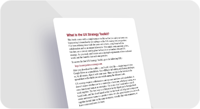 What Is the UX Strategy Toolkit? This book comes with a complimentary toolkit so that you and your teams can begin using it immediately for nailing a stellar UX strategy for your product. I’ve been refining these tools for years with clients, using them both for collaboration and as an output deliverable. They might seem unwieldy at first, but they are a crucial starting place to learn how to conduct efficient UX strategy. As you read, you’ll come across in-depth explanations of how each tool works and the benefits that each one provides. To access the free UX Strategy Toolkit, go to the following URL: http://userexperiencestrategy.com After you download the toolkit — an Excel (.xlsx) file — simply import it into Google Drive as a spreadsheet. You will have full editing and sharing privileges; so, by all means, share it with your team. There are tabs at the bottom of the spreadsheet with which you can switch among the different tools. UX strategy requires collaboration among team members and stakeholders. It doesn’t matter whether you’re a student in a classroom, a fledging startup, or a cross-functional team at an enterprise. The tactics don’t work unless you all work together. The best way to collaborate in this digital age is through cloud- based tools, and the cloud-based toolkit for this book will help you to align your onsite and remote teams to a product vision. It’s also great because you can work together in real time on the same document, virtually chat with teammates, or leave contextual notes for later.