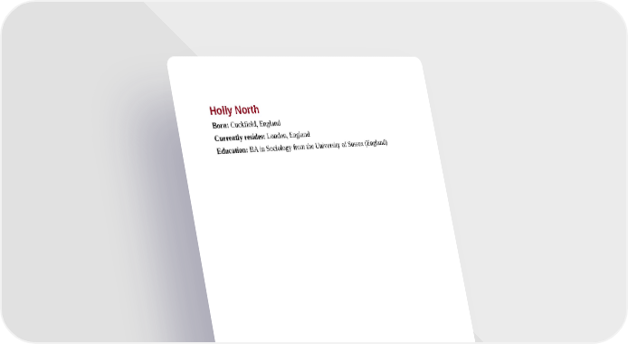 Holly North Born: Cuckfield, England Currently resides: London, England Education: BA in Sociology from the University of Sussex (England)