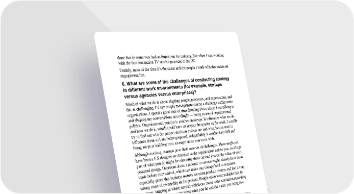 done that in some way had an impact on the industry, like when I was working with the first interactive TV service provider in the UK. Frankly, most of the time it’s the client and the people I work with that makes an engagement fun. 6. What are some of the challenges of conducting strategy in different work environments (for example, startups versus agencies versus enterprises)? Much of what we do is about aligning people, processes, and expectations, and this is challenging. I’d say people management can be a challenge within some organizations. I spend a good deal of time thinking about whom I am talking to and shaping my conversations accordingly — being aware of organizational politics. Organizational politics is another challenge. It influences what we do and how we do it, which could have an impact the quality of the work. I usually try to find out who the project decision makers are and what factors tend to influence them so I am better prepared. Adaptability is another key skill and being adept at building trust amongst those you work with. Although exciting, startups pose their own set of challenges. There might not have been a UX designer or strategist in the organization before you, so a large part of what you do might be educating those around you on the value of user- centered design. Decisions about a product or service might already have been made before your arrival, which can make any change hard to negotiate, especially given that business owners are often product owners and feel a very strong sense of ownership in the product. People often wear multiple hats in startups, jumping in where needed which can cause some confusion regarding your role. Clearly communicating what you do and the value you bring to a project or solution, as a UX strategist, is key. Time can also be a challenge. Startups often move at breakneck speeds to get a product to market, so you can be pushed to deliver quicker than you’re comfortable. It’s important to step back, slow down for a bit, and review where you are. Is the product or service supporting business priorities? Is it supporting the needs of the end users? Are you able to explain what the product or service is, in a way that your grandmother would understand? 7. Have you ever conducted any form of experiments on your product or UX strategy, whether it be trying to get market validation on a value proposition or testing