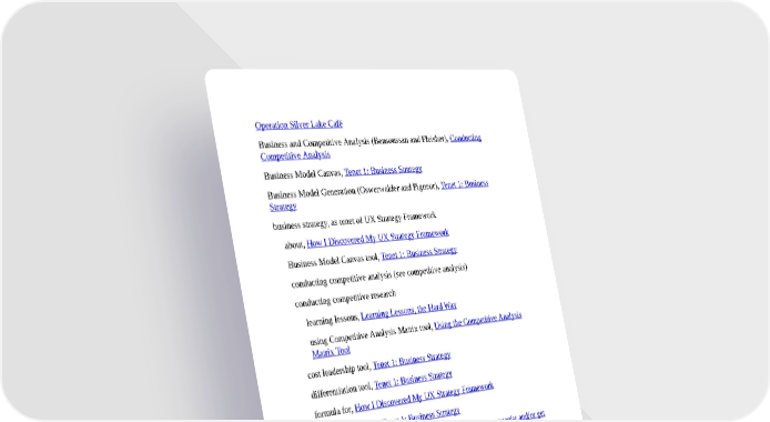 Operation Silver Lake Café Business and Competitive Analysis (Bensoussan and Fleisher), Conducting Competitive Analysis Business Model Canvas, Tenet 1: Business Strategy Business Model Generation (Oswerwalder and Pigneur), Tenet 1: Business Strategy business strategy, as tenet of UX Strategy Framework about, How I Discovered My UX Strategy Framework Business Model Canvas tool, Tenet 1: Business Strategy conducting competitive analysis (see competitive analysis) conducting competitive research learning lessons, Learning Lessons, the Hard Way using Competitive Analysis Matrix tool, Using the Competitive Analysis Matrix Tool cost leadership tool, Tenet 1: Business Strategy differentiation tool, Tenet 1: Business Strategy formula for, How I Discovered My UX Strategy Framework map app Waze tool, Tenet 1: Business Strategy business strategy, learning about, 1. How did you become a strategist and/or get into doing strategy as part of your work?, 2. What does UX strategy mean to you? Is it a bogus job title?, 2. What does UX strategy mean to you? Is it a bogus job title?, 3. How did you learn about business strategy? business tasks, Funnel Matrix, Desired Action C Calacanis, Jason, Foreword Carey, Chase, 3. How did you learn about business strategy?