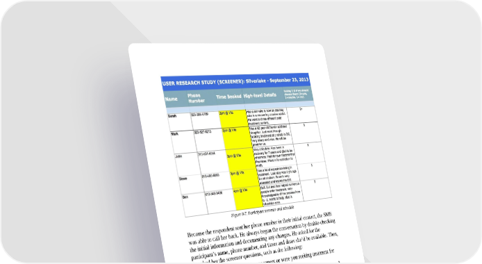 Figure 8-7. Participant screener and schedule Because the respondent sent her phone number in their initial contact, the SME was able to call her back. He always began the conversation by double-checking the initial information and documenting any changes. He asked for the participant’s name, phone number, and times and dates she’d be available. Then, he asked her the screener questions, such as the following: Were you the person seeking treatment or were you seeking treatment for someone else? Do you mind telling me how much you paid? Where and when did you go? (To confirm it was residential and for how long.) We needed people who had paid for themselves or loved ones to go to a treatment center, which is why we asked the first question. We needed their experience to be recent (within three years), and we needed to ensure that they could afford paying a certain amount for a rehabilitation, which is why we asked the second question. We also ensured that the ad didn’t reveal that potential participants would be grilled with screener questions as a means to help cut out respondents who just wanted to make money.