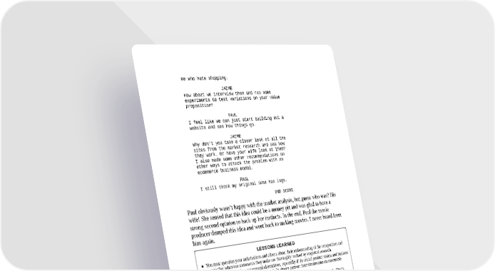 me who hate shopping. JAIME How about we interview them and run some experiments to test variations on your value proposition? PAUL I feel like we can just start building out a website and see how things go. JAIME Why don't you take a closer look at all the sites from the market research and see how they work. Or have your wife look at them? I also made some other recommendations on other ways to attack the problem with an ecommerce business model. PAUL I still think my original idea has legs. END SCENE. Paul obviously wasn’t happy with the market analysis, but guess who was? His wife! She sensed that this idea could be a money pit and was glad to have a strong second opinion to back up her instincts. In the end, Paul the movie producer dumped this idea and went back to making movies. I never heard from him again. LESSONS LEARNED You must question your stakeholders and clients about their understanding of the competition and ensure that whatever statements they make are thoroughly backed by empirical research. The analysis should also recommend alternatives, especially if the initial product vision and business model have risks. After all, you do want to help clients convert their dreams into an executable strategy. Sometimes, people have fixed ideas, and no amount of research will change their minds. That’s when the strategist has to ask a personal and ethical question of herself: will I help this person make the product regardless of the research, or do I walk away?