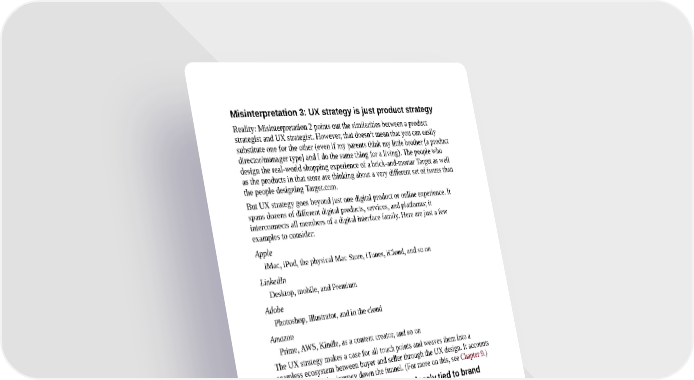Misinterpretation 3: UX strategy is just product strategy Reality: Misinterpretation 2 points out the similarities between a product strategist and UX strategist. However, that doesn’t mean that you can easily substitute one for the other (even if my parents think my little brother [a product director/manager type] and I do the same thing for a living). The people who design the real-world shopping experience of a brick-and-mortar Target as well as the products in that store are thinking about a very different set of issues than the people designing Target.com. But UX strategy goes beyond just one digital product or online experience. It spans dozens of different digital products, services, and platforms; it interconnects all members of a digital interface family. Here are just a few examples to consider: Apple iMac, iPod, the physical Mac Store, iTunes, iCloud, and so on LinkedIn Desktop, mobile, and Premium Adobe Photoshop, Illustrator, and in the cloud Amazon Prime, AWS, Kindle, as a content creator, and so on The UX strategy makes a case for all touch points and weaves them into a seamless ecosystem between buyer and seller through the UX design. It accounts for the user’s entire journey down the funnel. (For more on this, see Chapter 9.) Misinterpretation 4: UX strategy is closely tied to brand strategy Reality: brand strategy is how, what, where, when, and to whom you plan on communicating and delivering your brand messages through your distribution channels. Aspects of brand strategy can help define aspects of your product’s UX design, and vice versa. But it’s easy to confuse these branding efforts and goals with a UX strategy. A poor UX can actually decrease the “brand value” of a product, but not so much the other way around. Even the brandiest of brands can’t overcome the poor UX of a product. [5] In their book Lean Entrepreneur, Brant Cooper and Patrick Vlaskovits say,