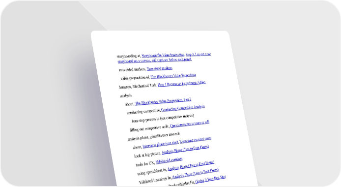storyboarding at, Storyboard the Value Innovation, Step 3: Lay out your storyboard on a canvas, add captions below each panel. two-sided markets, Two-sided markets value proposition of, The Blockbuster Value Proposition Amazon, Mechanical Turk, How I Became an Experiment Addict analysis about, The Blockbuster Value Proposition, Part 2 conducting competitive, Conducting Competitive Analysis four-step process in (see competitive analysis) filling out competitive audit, Questions/notes to team or self analysis phase, guerrilla user research about, Interview phase (one day), Extracting succinct notes look at big picture, Analysis Phase (Two to Four Hours) tools for UX, Validated Learnings using spreadsheet in, Analysis Phase (Two to Four Hours) Validated Learnings in, Analysis Phase (Two to Four Hours) Andreessen, Marc, on Product/Market Fit, Giving It Your Best Shot applied simplicity, Preface Art of War (Sun Tzu), The Four Tenets of UX Strategy assumptions being honest about making, Step 2: Identify your customer segment’s (biggest) problem determining riskiest, Interview phase (one day) guerrilla user research and, Extracting succinct notes