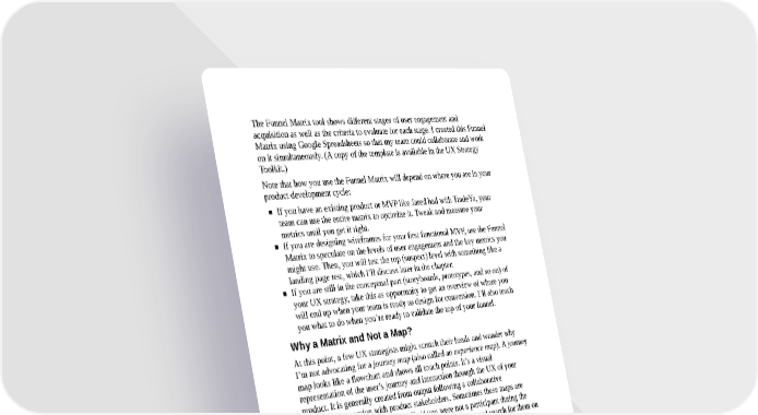 The Funnel Matrix tool shows different stages of user engagement and acquisition as well as the criteria to evaluate for each stage. I created this Funnel Matrix using Google Spreadsheets so that my team could collaborate and work on it simultaneously. (A copy of the template is available in the UX Strategy Toolkit.) Note that how you use the Funnel Matrix will depend on where you are in your product development cycle: If you have an existing product or MVP like Jared had with TradeYa, your team can use the entire matrix to optimize it. Tweak and measure your metrics until you get it right. If you are designing wireframes for your first functional MVP, use the Funnel Matrix to speculate on the levels of user engagement and the key metrics you might use. Then, you will test the top (suspect) level with something like a landing page test, which I’ll discuss later in the chapter. If you are still in the conceptual part (storyboards, prototypes, and so on) of your UX strategy, take this as opportunity to get an overview of where you will end up when your team is ready to design for conversion. I’ll also teach you what to do when you’re ready to validate the top of your funnel. Why a Matrix and Not a Map? At this point, a few UX strategists might scratch their heads and wonder why I’m not advocating for a journey map (also called an experience map). A journey map looks like a flowchart and shows all touch points. It’s a visual representation of the user’s journey and interaction through the UX of your product. It is generally created from output following a collaborative brainstorming session with product stakeholders. Sometimes these maps are quite complex to decipher, especially if you were not a participant during the session. If you haven’t seen one of these maps, do a keyword search for them on Google Images. When used effectively, a journey map can aid the UX strategist and stakeholders in envisioning cross-channel experiences through digital and nondigital touch points. Personally, I find that the map takes too darn long to create and lacks accountability because it is rarely benchmarked to the product’s reality after it begins to be released. Here’s what I’ve seen happen all too often: the key stakeholders, internal UX team, or both are called together for a consensus- building session. They break into groups, jot down ideas on sticky notes, and then post them on a wall or board. Everybody stands back while the most assertive participants reorganize the concepts into clusters. At the end of the