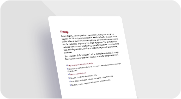 Recap In this chapter, I showed you how a successful UX strategy uses analytics to optimize the UX design, demonstrated the use of a tool called the Funnel Matrix and its different stages of customer acquisition, and discussed how metrics prove that the customer is progressing into deeper engagement. You also learned how to design for conversion with landing pages and bring together a cross-functional team including designers, developers, product managers, and, most important, marketers. This concludes all the techniques I will be sharing for conducting UX strategy. Now it’s time to hear from other strategists to see what their perspectives are. [63] http://en.wikipedia.org/wiki/Growth_hacking [64] Cooper, Brant and Patrick Vlaskovits. The Entrepreneur’s Guide to Customer Development. Cooper- Vlaskovits, 2010. [65] http://www.edwardtufte.com [66] Ries, Eric. Lean Startup. HarperBusiness, 2011. [67] Croll, Alistair and Benjamin Yoskovitz. Lean Analytics. O’Reilly Media, 2013. [68] Rushkoff, Douglass. Program or be Programmed. Soft Skull Press, 2011.