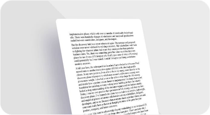 implementation phase, which took over six months of emotionally fueled hand- offs. There were hundreds of pages of wireframes and functional specifications traded between stakeholders, designers, and developers. But the discovery brief was never referenced again. The personas and proposed solution were never validated by existing customers. The stakeholders went back to fighting for whatever prime real estate they could grab for their particular business units. Yet, there was something good that came out of that discovery phase for me: I was a UX designer who finally got a taste of what a UX strategy could potentially be. I was ruined. I couldn’t imagine just being a wireframe monkey anymore. A full year later, the redesigned site launched. I never looked at it because I had moved onto to another interactive agency (HUGE) with other high-profile clients. In my new position, I was able to focus my energy more directly on the discovery phase of projects in which user research and business strategy were given more weight. I also had a seat at the table to help shape the UX strategy and decide how a product vision should be implemented. I no longer had to feel fraudulent for spending so many waking hours building products for which I lacked a deep understanding of the customer segment and the business model. Today, I run my own practice that specializes in UX strategy, and since my first discovery phase, I’ve learned a lot about how to make it an iterative, lightweight, and empirical process of intense collaboration among stakeholders, designers, developers, and so on. Because when everyone shares a product vision, you and your team really have a chance at changing the rules of the game for your product, company, and future customers. However, I do want to acknowledge that my methodology is my version of UX strategy and might be different from other strategists’. That’s precisely why I included Chapter 10, which contains profiles of people I respect who have been practicing UX strategy and design as well. However, you’ll also see that we align on a lot of things. That’s what happens when a new discipline or methodology arises: people will find their own approach, but even within those differences, there are connective tissues that bind them together to make UX strategy identifiable and unique. So, with all that said, cue the drum roll to introduce my UX strategy framework, as presented in Figure 2-2.