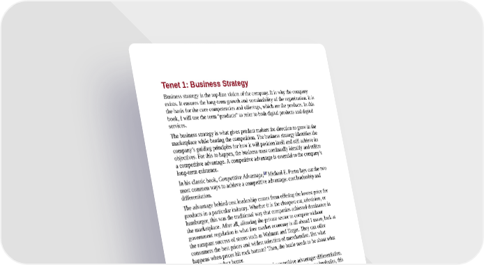 Tenet 1: Business Strategy Business strategy is the top-line vision of the company. It is why the company exists. It ensures the long-term growth and sustainability of the organization. It is the basis for the core competencies and offerings, which are the products. In this book, I will use the term “products” to refer to both digital products and digital services. The business strategy is what gives product makers the direction to grow in the marketplace while beating the competition. The business strategy identifies the company’s guiding principles for how it will position itself and still achieve its objectives. For this to happen, the business must continually identify and utilize a competitive advantage. A competitive advantage is essential to the company’s long-term existence. [9] In his classic book, Competitive Advantage, Michael E. Porter lays out the two most common ways to achieve a competitive advantage: cost leadership and differentiation. The advantage behind cost leadership comes from offering the lowest price for products in a particular industry. Whether it is the cheapest car, television, or hamburger, this was the traditional way that companies achieved dominance in the marketplace. After all, allowing the private sector to compete without government regulation is what free market economy is all about! I mean, look at the rampant success of stores such as Walmart and Target. They can offer consumers the best prices and widest selection of merchandise. But what happens when prices hit rock bottom? Then, the battle needs to be about what makes the product better. This brings us to Porter’s second type of competitive advantage: differentiation. Because we are product inventors planning to build disruptive technologies, this is where our actual power lies. With differentiation, the advantage is based on a new or unique product or a unique aspect of the product for which customers will pay a premium because of its perceived value. As consumers, we choose one product over another based on the things we personally value, ranging from the product’s usefulness to how much pleasure we derive from it. That perceived value is what transforms a simple little café and cup o’ joe into the crazy success story of Seattle-based Starbucks. There’s a reason why people pay $5 for a cafe latté — it’s the experience that’s also wrapped into the product. It starts the moment a customer steps into the store and ends when that person tosses his cup and sleeve into the trash.