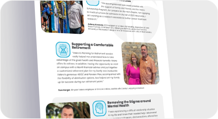 88 Scholarships to Achieve Educational Success “This accomplishment was made possible with the support of family and friends, and the Valero Scholarship Program. As I prepare for the next chapter, I am applying to medical schools for admission in the fall of 2023. Meanwhile, I am working as a research associate to further cancer treatment research.” Antony Alvarado , 2021 recipient of a Valero Scholarship, dependent of Jose Perez-Camas, Chief Mechanic, Wilmington Refinery, graduated from the University of Rochester College of Arts and Sciences, with a B.S. in Biochemistry. Supporting a Comfortable Retirement “Valero’s Planning for Retirement session really helped me understand how to take advantage of the great health and financial benefits Valero offers its retirees. In addition, having the opportunity to meet on campus with a Merrill financial advisor and put together a customized retirement plan for my family was invaluable. Valero’s generous 401(k) and Pension Plan, accompanied with the flexibility of distribution options, has helped set my family up for success during our retirement years.” Removing the Stigma around Mental Health “I was experiencing a difficult relationship situation in my life and I knew that I needed help. I discovered that our Employee Assistance Program, LifeConnections, offered free counseling sessions. Through this program, I began to understand the importance and impact of taking care of my mental health. Through this process, I’ve learned that I am stronger because I’m getting help and that there are others like me with these types of concerns. I hope other employees will take advantage of the mental health resources Valero offers.” David Purcell , Lead Office & Print Services Specialist Total Wellness in Action Tom Karger , 18-year Valero employee and recent retiree, and his wife Carolyn, enjoying retirement