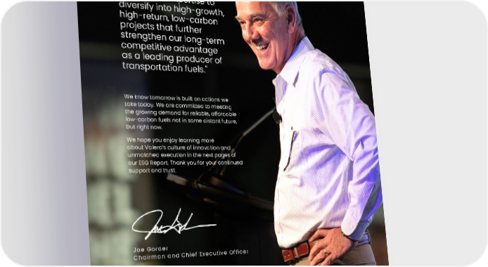 ENVIRONMENTAL, SOCIAL AND GOVERNANCE REPORT • 5 We know tomorrow is built on actions we take today. We are committed to meeting the growing demand for reliable, affordable low-carbon fuels not in some distant future, but right now. We hope you enjoy learning more about Valero’s culture of innovation and unmatched execution in the next pages of our ESG Report. Thank you for your continued support and trust. Joe Gorder Chairman and Chief Executive Officer "We are leveraging our liquid-fuels platform and operational expertise to diversify into high-growth, high-return, low-carbon projects that further strengthen our long-term competitive advantage as a leading producer of transportation fuels." ENVIRONMENTAL, SOCIAL AND GOVERNANCE REPORT • 5