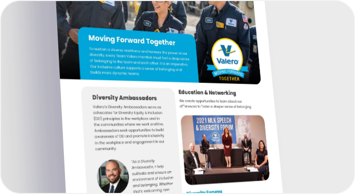 90 Moving Forward Together To sustain a diverse workforce and harness the power of our diversity, every Team Valero member must feel a deep sense of belonging to the team and each other. It is an imperative. Our inclusive culture supports a sense of belonging and builds more dynamic teams. Education & Networking We create opportunities to learn about our differences to foster a deeper sense of belonging. Diversity Forums Team events, many in support of cultural and community events, help build understanding within our workforce. Our 2021 MLK Speech & Diversity Forum was held live and recorded for all Valero sites to listen and learn from their peers. Diversity Ambassadors Valero’s Diversity Ambassadors serve as advocates for Diversity Equity & Inclusion (DEI) principles in the workplace and in the communities where we work and live. Ambassadors seek opportunities to build awareness of DEI and promote inclusivity in the workplace and engagement in our community. “As a Diversity Ambassador, I help cultivate and ensure an environment of inclusion and belonging. Whether that’s welcoming new employees or connecting people to events/ organizations at work or in the community, the Diversity Ambassadors help build a stronger, more inclusive workforce here at Valero.” - Mark Williams , Sr. Manager Wholesale Marketing.