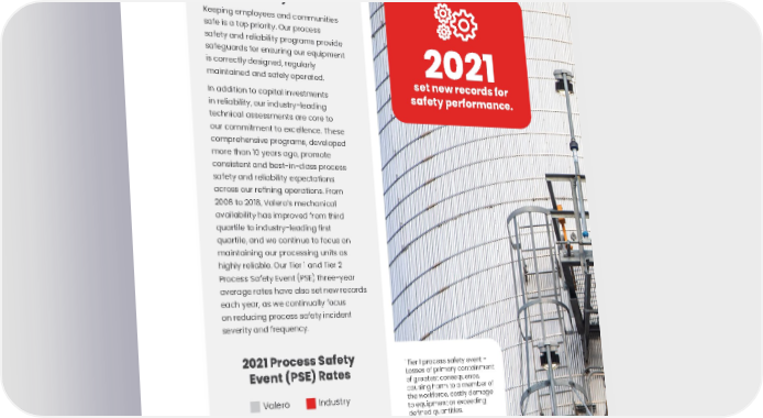 46 Process Safety and Mechanical Availability Process Safety Keeping employees and communities safe is a top priority. Our process safety and reliability programs provide safeguards for ensuring our equipment is correctly designed, regularly maintained and safely operated. In addition to capital investments in reliability, our industry-leading technical assessments are core to our commitment to excellence. These comprehensive programs, developed more than 10 years ago, promote consistent and best-in-class process safety and reliability expectations across our refining operations. From 2008 to 2018, Valero’s mechanical availability has improved from third quartile to industry-leading first quartile, and we continue to focus on maintaining our processing units as highly reliable. Our Tier 1 and Tier 2 Process Safety Event (PSE) three-year average rates have also set new records each year, as we continually focus on reducing process safety incident severity and frequency. 2021 set new records for safety performance. 2021 Process Safety Event (PSE) Rates Tier 2 2 0.05 Tier 1 1 0.08 0.15 0.18 Valero Industry 1 Tier 1 process safety event - Losses of primary containment of greatest consequence, causing harm to a member of the workforce, costly damage to equipment or exceeding defined quantities. 2 Tier 2 process safety event - Losses of primary containment of lesser consequence than Tier 1. Tier 1 PSE rate and Tier 2 PSE rate as defined by the API Recommended Practice 754.